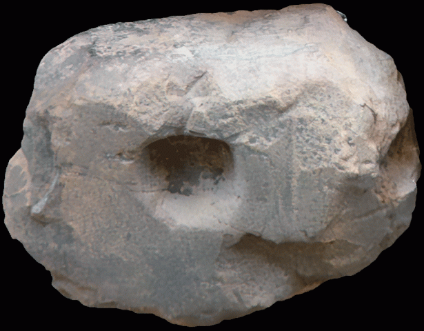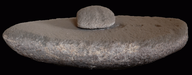 Sogenannte Sattelmühle. Zum Verreiben von Getreide zu Mehl. Verwendet in der Jungsteinzeit 5000 bis 2200 vor Christus, sowie in der Bronzezeit 2200 bis 800 vor Christus